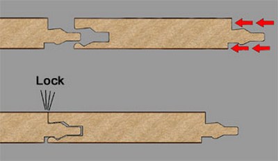Панелі ламінату укладають «плаваючим» способом. Суть цього способу така: панелі скріплюються між собою за допомогою клею ПВА або ж спеціальної замкової системи.