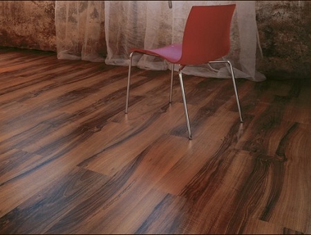Любителі романтики і стилю мінімалізм по достоїнству оцінять односмуговий ламінат з вощеного поверхнею і фаскою кольору горіх. Таке покриття ідеально впишеться навіть в самий простий інтер’єр, гармонійно доповнюючи собою білі стіни й темні меблі.