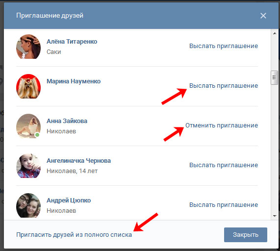 Якщо ж у Вас є певні вимоги до людей, які будуть передплатниками Вашої групи – вони повинні цікавитися чимось певним, проживати в певному місті і інше, тоді натисніть на кнопочку «Запросити друзів з повного списку».