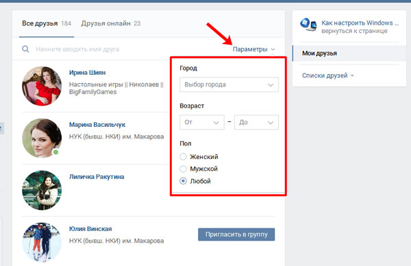 Тепер натисніть кнопку «Параметри». У випадаючому вікні можна вибрати місто, вік і стать людини. Після цього у списку залишаться користувачі, які відповідають вказаним критеріям. Надсилайте їм запрошення в групу, натиснувши на кнопочку «Запросити в групу».