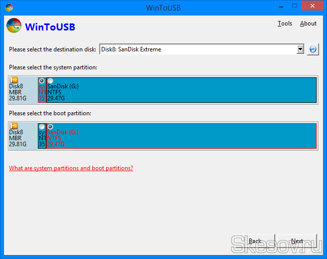 3) У випадаючому списку вибираємо пристрій для запису і вказуємо розділи для завантажувального і системних секторів. Для цього видалити всі розділи на носії і створити спочатку один розділ з розміром 350мб під системний розділ (букву йому можна не задавати), а потім другий під установку операційної системи на простір, що залишився .