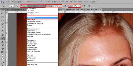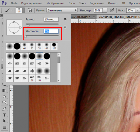 Потім беремо інструмент Пензлик і налаштовуємо його. Режим вибираємо Затемнення, Непрозорість – 50% і Натискання – 50%.