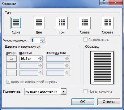 Відкриється діалогове вікно «Колонки», в якому ви можете вказати кількість колонок, їх параметри (ширину) і т. д.