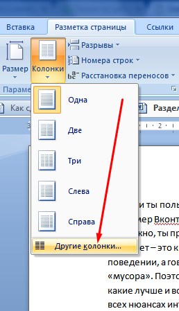 Далі знаходимо кнопку «Колонки», тиснемо на неї і вибираємо кількість колонок, яке вам необхідно. Стандартно ворд надає можливість створити дві, три колонки, а також одну маленьку ліворуч або праворуч.