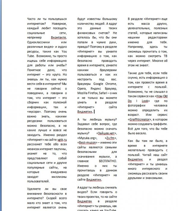 Текст, розбитий на колонки, найчастіше зустрічається в газетних або журнальних публікаціях або енциклопедіях старого зразка. Погодьтеся, адже це виглядає дуже навіть цікаво і привабливо.