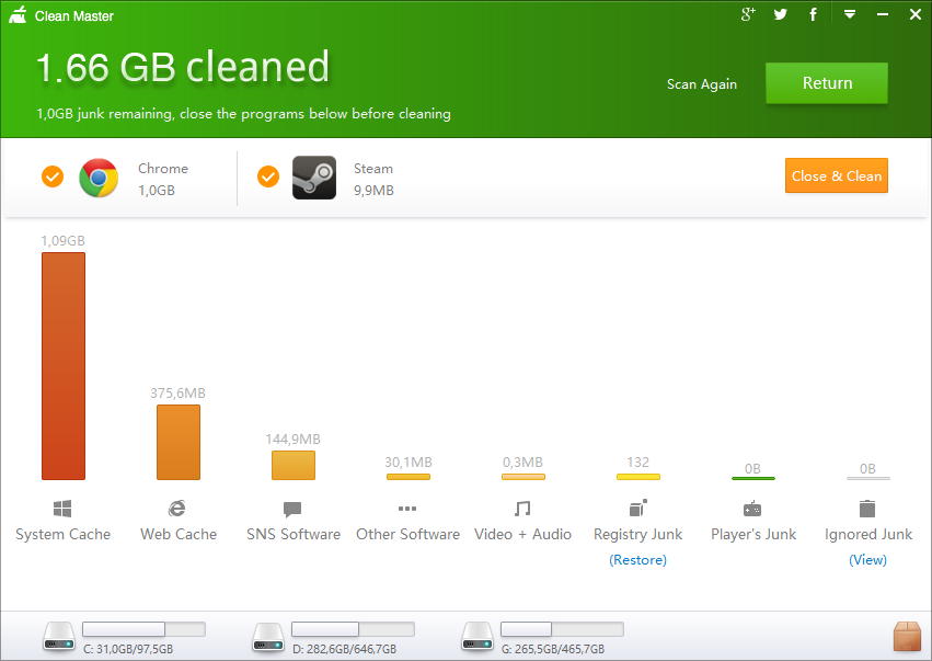 Підводячи підсумок, хочеться сказати, що Clean Master — прекрасна програма для різних категорій користувачів. Нанести шкоду комп’ютера практично неможливо, навіть якщо її використовує новачок. У той же час, ця програма очищає ті місця, які найбільше схильні до захаращення і викликають гальма в роботі комп’ютера. Періодична очищення (хоча б 1 раз в 2 тижні) допоможе підтримувати операційну систему в чистоті і сприятливо впливає на швидкість її роботи.