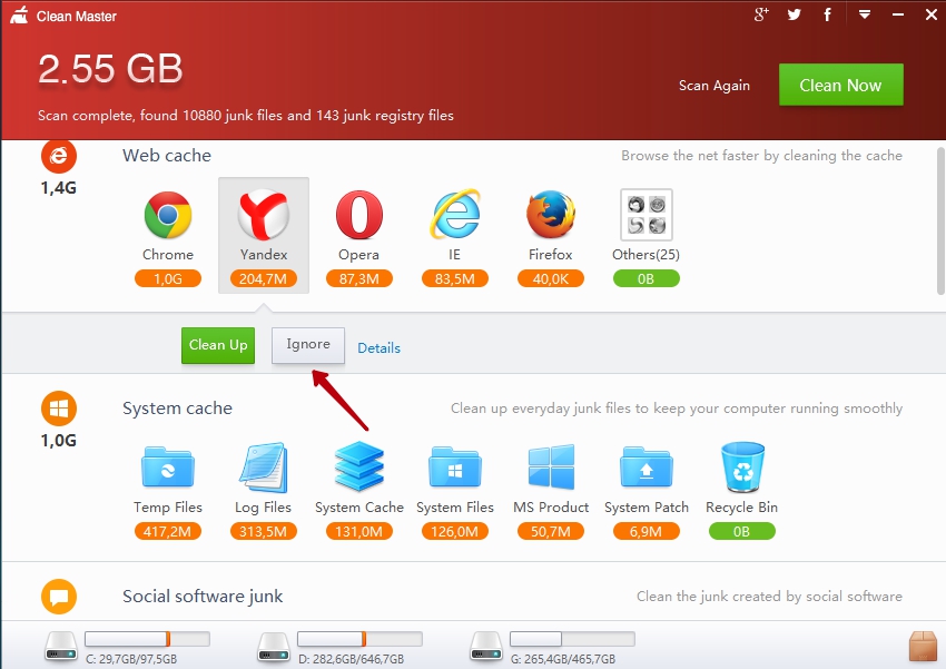 Приміром, вам не потрібно очищати браузер Yandex. Натисніть на нього, і в кнопках виберіть Ignore. Це означає, що при загальній очищення програма не торкнеться Yandex. За цією аналогією вчините з іншими важливими для вас програмами.
