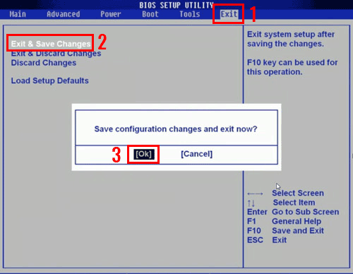 • Перейдіть на вкладку «Exit», натисніть на рядок «Exit and Save», а потім – на «Ok».