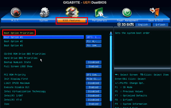 Як встановити завантаження з диска в UEFI від інших виробників – MSI або Gigabyte? Все, що вам потрібно – знайти пункт «Boot Priority» і змінити пріоритет включення пристроїв. В Gigabyte він знаходиться в розділі «BIOS Features».