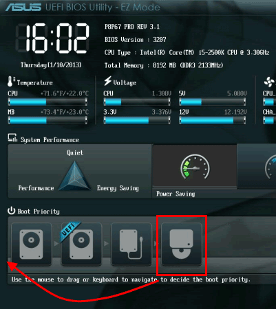 Наприклад, у ASUS розділ Boot Priority («Пріоритет завантаження») знаходиться внизу. І тут відображаються всі підключені пристрої – вінчестер, CR-ROM, флешка. Вам лише потрібно мишкою перетягнути значок диска на першу позицію, як показано на скріншоті.