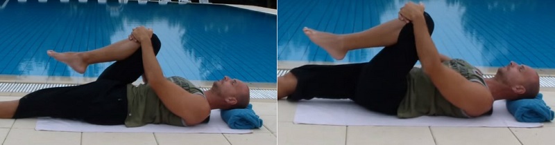 Виконуй вправу, лежачи на спині. Зігни праву ногу в коліні, обхопи її руками і максимально підтягни до живота. Намагайся не натягувати ногу сильно і не завдавати собі біль. Залишся в цьому положенні на 10-15 секунд. Повтори вправу з лівою ногою.