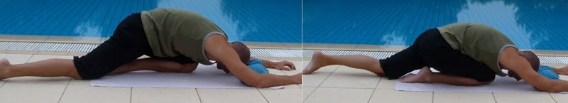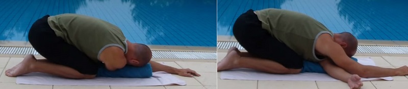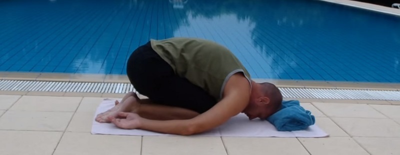 Попередньо підібгавши ноги, сядь на п’яти, потім нахили корпус таким чином, щоб ти міг торкнутися чолом килимка або спеціального валика. Залишся в цьому положенні на 10-15 секунд.