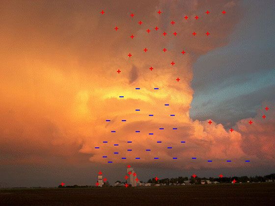 А позитивним зарядом має земна поверхня. З цієї причини електрони, розташовані в хмарі, притягуються до землі і спрямовуються вниз. Як тільки перші електрони досягають поверхні землі, створюється вільний для пропуску електричних розрядів канал, по якому залишилися електрони спрямовуються вниз. Електрони біля землі першими йдуть з каналу. На їх місце поспішають потрапити інші. Створюється умова, при якому весь негативний розряд енергії виходить з хмари, створюючи потужний потік електрики, спрямований в землю. Ось в такий момент і можливий спалах блискавки, що супроводжується раскатом грому.