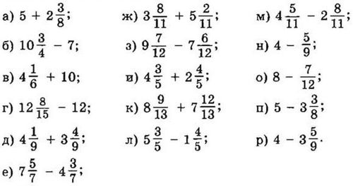 - Якщо ж від дробового виразу необхідно відняти ціле число, не потрібно представляти друге число у вигляді дробу, досить зробити дію тільки над цілими частинами.