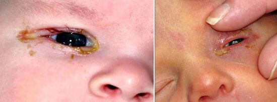 Рис. 10. На фото кір у дітей. Приєднання вторинної інфекції призводить до розвитку бактеріального кон’юнктивіту. Кон’юнктива очей гиперемируется, повіки набрякають, з очей з’являються гнійні виділення.