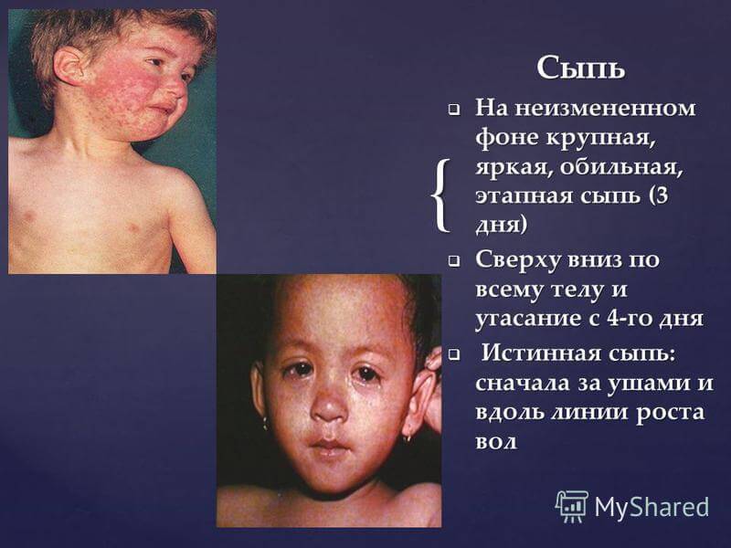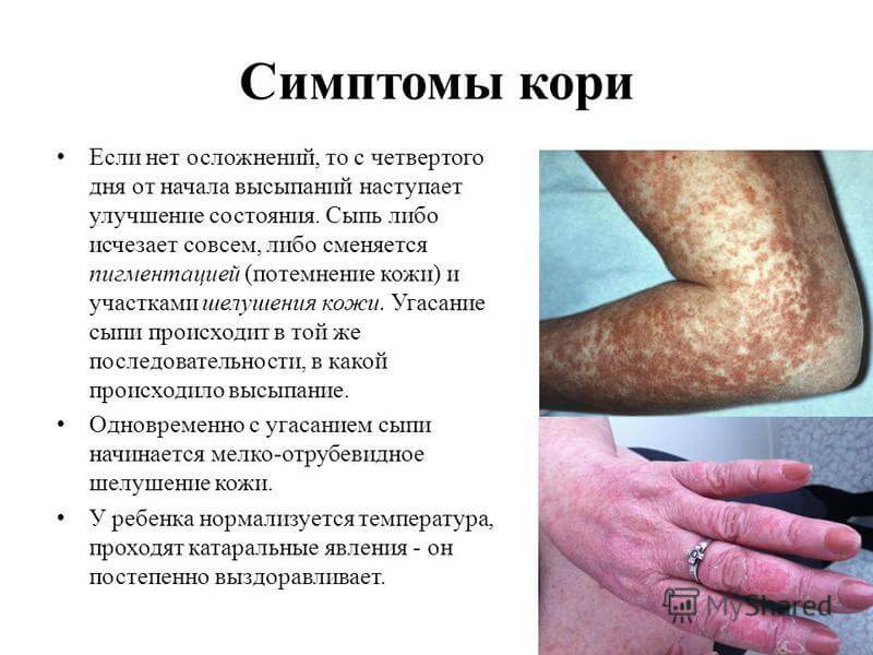 При виникненні висипів (приблизно 4-5 днів) температура починає спадати, і дитина навіть при наявності ще нежитю і кашлю поступово відновлюється. Через кілька днів висип стає бурого кольору, далі вона починає відшаровуватися.