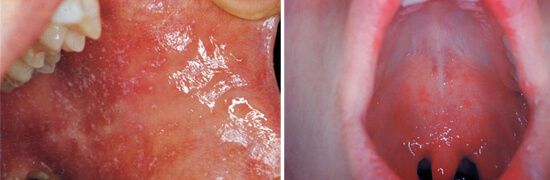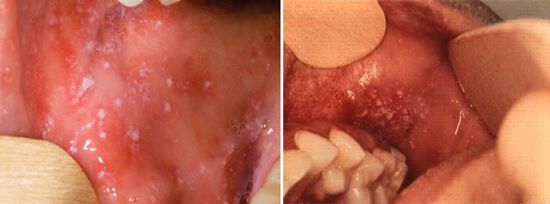 Рис. 4. На фото симптоми кору — плями Бельського-Філатова-Коплика на слизовій оболонці щік і корова енантема в області неба.