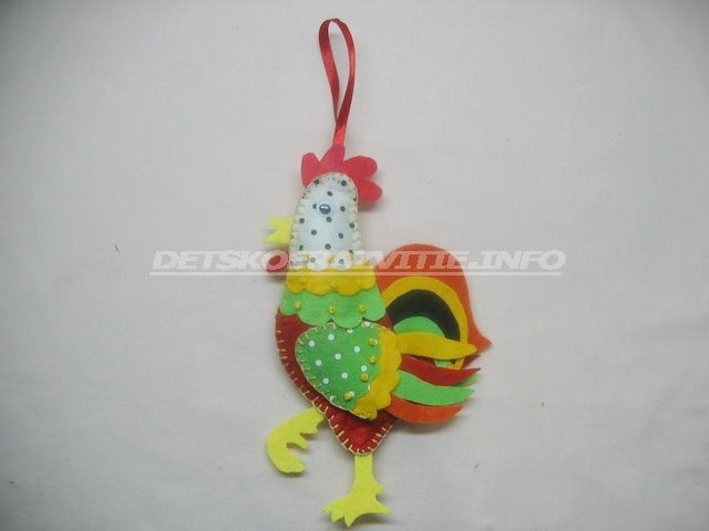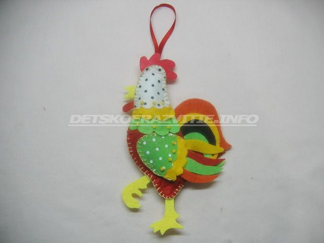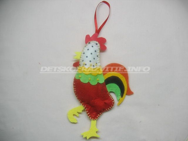 Починаючи від хвостової частини, фігурку півня зшивають, використовуючи лицьовій обметочний шов. У процесі роботи вшивають гребінь, сформовану з шовкової стрічки петлю для підвішування, дзьоб, бороду, лапи. Перед вшиванием лап підвіску наповнюють синтепоном.