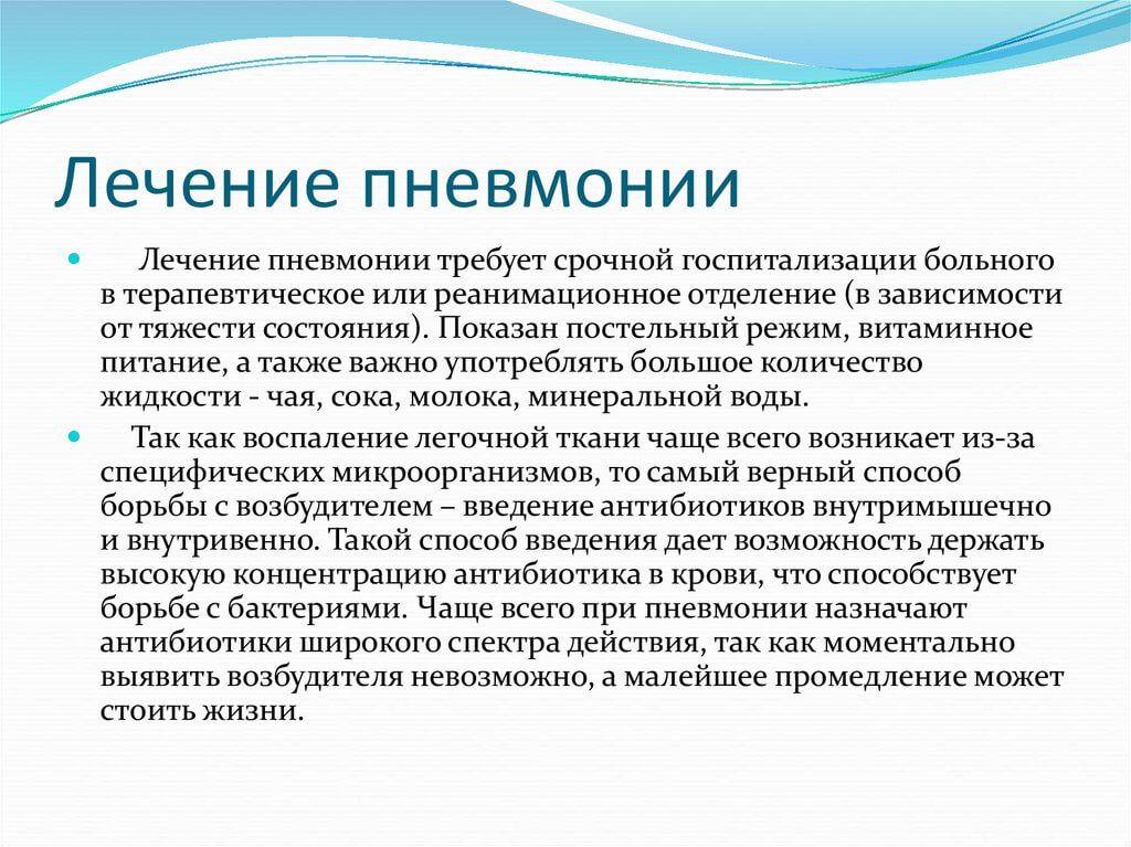 При неважких типах пневмонії дитину можна залишити вдома після проведення рентгенообследования, при організації «стаціонару вдома» (щоденний огляд лікаря, виконання всіх призначень) і достатньої медичної культури батьків, сприятливих мікросоціальних умов.