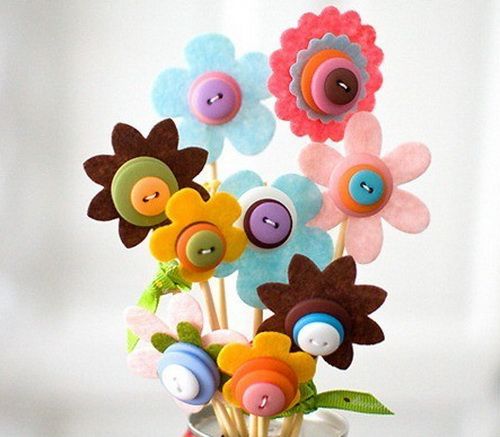 З фетрових лоскутов вирізають суцвіття різної форми. Серединку квітки оформляють у вигляді гудзики. Стеблом служать бамбукові шпажки.