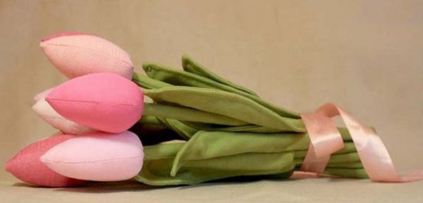 Мають навички шиття зможуть піднести мамі в святковий день текстильні букети тюльпанів або кімнатних квітів у горщиках.