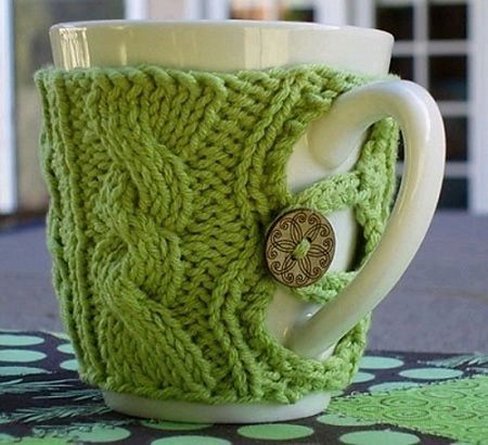 Елегантно буде виглядати футляр для чашки, виконаний спицями і прикрашений рельєфними косами.