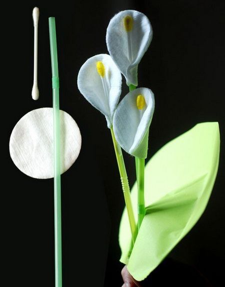 Помістивши всередину згорнутих конусом ватяних дисків гігієнічні палички, імітують тичинки квітки. Бутон кріплять на стебельце — трубочку для коктейлю і доповнюють листком, вирізаним з шовкової стрічки або кольорового паперу. Складання такого букета здійснюють з допомогою клею.