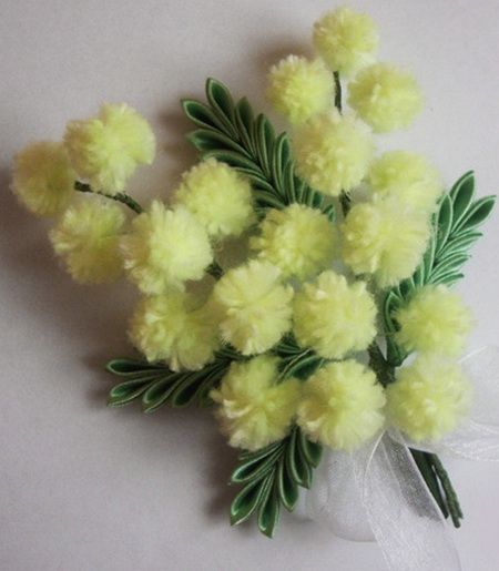 Використовуючи вовняну пряжу лимонного кольору, формують пишні помпони однакової величини. Листочки рослини складають з модулів зібраної в техніці канзаші атласної стрічки. Складання такої композиції найвдаліше здійснювати з допомогою силіконового клею.