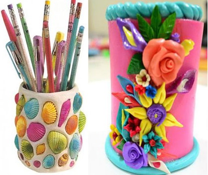 Діти молодших класів можуть зробити своїми руками підставки в інших варіантах. Знадобиться жорсткий пластиковий стакан або жерстяна банка. Оформлення може бути різним все залежить від фантазії дитини.