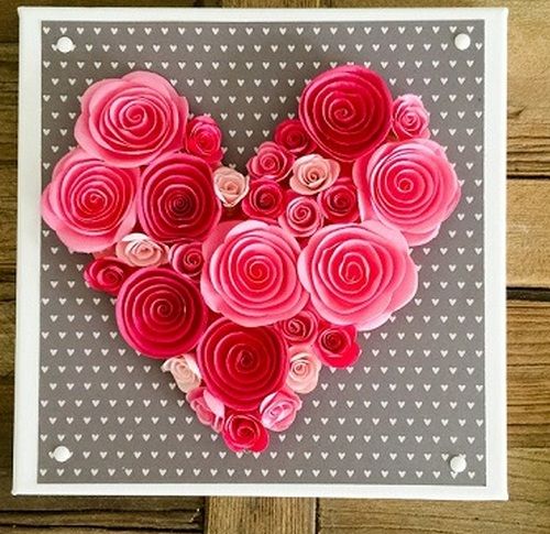 Утворені квіти троянд різних відтінків приклеюють на вибраний в якості основи картон у формі серця. Ніжна тональність листівки припаде до душі як дівчині, так і її обранця.