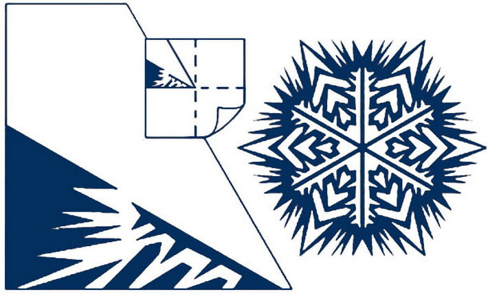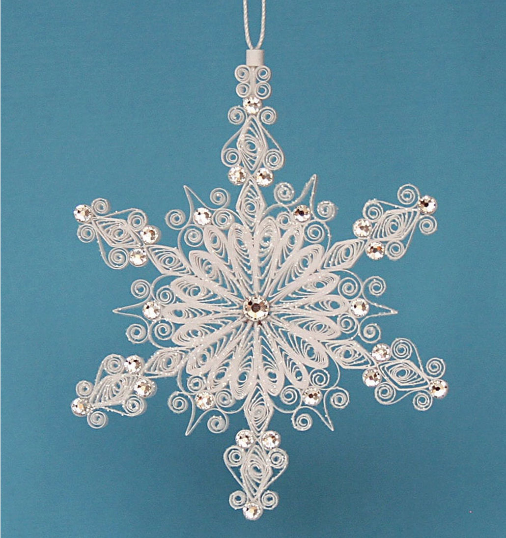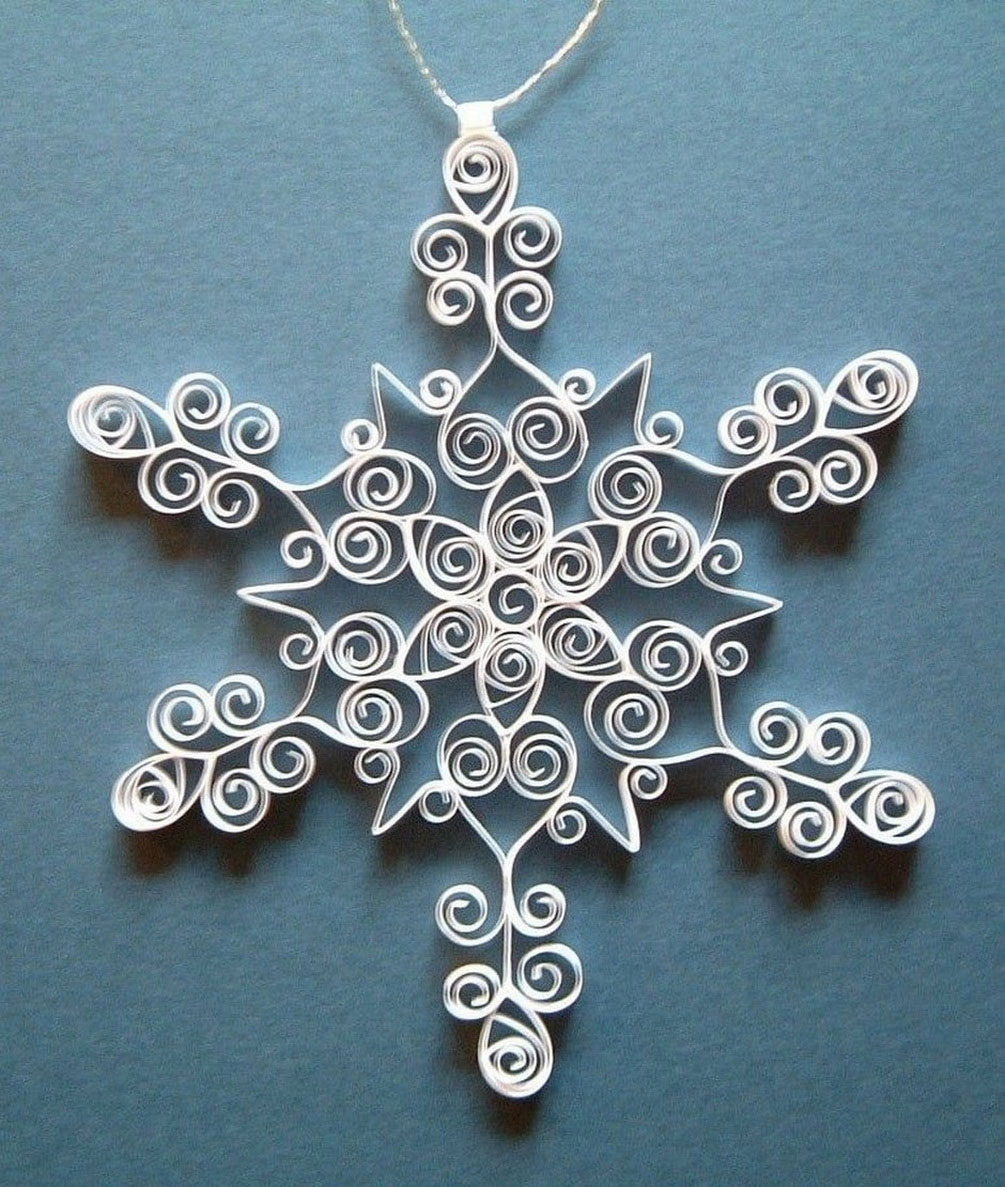 3. Квиллинговые сніжинки. Техніка квілінгу передбачає використання спіралей з вузьких смужок паперу. Приклад такої сніжинки представлений на малюнку — збільшіть і роздрукуйте: