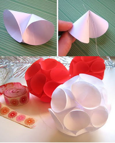 9. 3-D прикраси. Основною особливістю такого декору є об’ємність. Оформлення забавних дрібничок допомогою 3-D технологій гармонійно впишуться в будь-який інтер’єр. Для приготування такого декору знадобляться: клей-олівець, ножиці, папір, голка з ниткою, олівець. На першому етапі виготовлення прикраси потрібно вирізати 10 однакових кіл з білого паперу. Потім потрібно олівцем на кожному колі визначити радіус і розрізати лінію радіуса. На наступному етапі потрібно зробити з допомогою клею 2 конуса. На малюнку представлена схема зовнішнього вигляду прикраси.