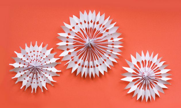 Для виготовлення гофрованого вироби знадобляться: офісний папір, ножиці, степлер, клей. На першому кроці знадобиться розрізати аркуш формату А4 навпіл. Потім обидва аркуші паперу скласти гармошкою. Потім потрібно знайти центральну точку на аркушах, складених гармошкою. Для цього потрібно скласти гармошечные листи навпіл і розгорнути назад. Центральну точку скріпити степлером. На наступному кроці потрібно вирізати візерунок. При виборі візерунка слід усвідомлювати, що його доведеться для симетрії повторити і на другому аркуші паперу. Потім листок розгорнути і кінці склеїти клеєм, щоб утворився півколо. Завершальним кроком є з’єднання двох половинок сніжинок в єдине ціле. Готовий результат представлений на рисунку: