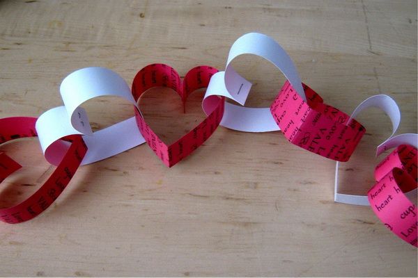 5. Гірлянди. Найпростіший варіант для прикраси приміщення є проста ланцюгова гірлянда. Для її виготовлення знадобляться проста або кольоровий папір, ножиці, клей. Розрізати папір на смужки, приклеїти кінці смужок один до одного. Можна з’єднувати степлером. Кінцевий результат показаний на малюнку.