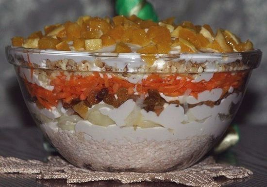 Французька коханка. Це варіація відомого салату, відрізняє пікантним смаком за рахунок курячого філе і цибулі. Обов’язково кожен шар змащувати майонезом. Для приготування салату необхідно зварити 300 гр курячого філе, потім його дрібно порізати. Курка буде першим шаром. Другий шар складається з маринованої цибулі. Для цього потрібно дві цибулини порізати півкільцями, додати в інгредієнт дрібку солі, цукру, крапельку оцту і обдати окропом. Маринований цибулю покласти на філе. Третім шаром вважається 200 гр запареного родзинок. Четвертий шар складається з двох тертих морквин. П’ятий шар – тертий на тертці сир (не більше 70 гр). Прикрасити салат склянкою волоських горіхів і порізаною кубиками два апельсина.