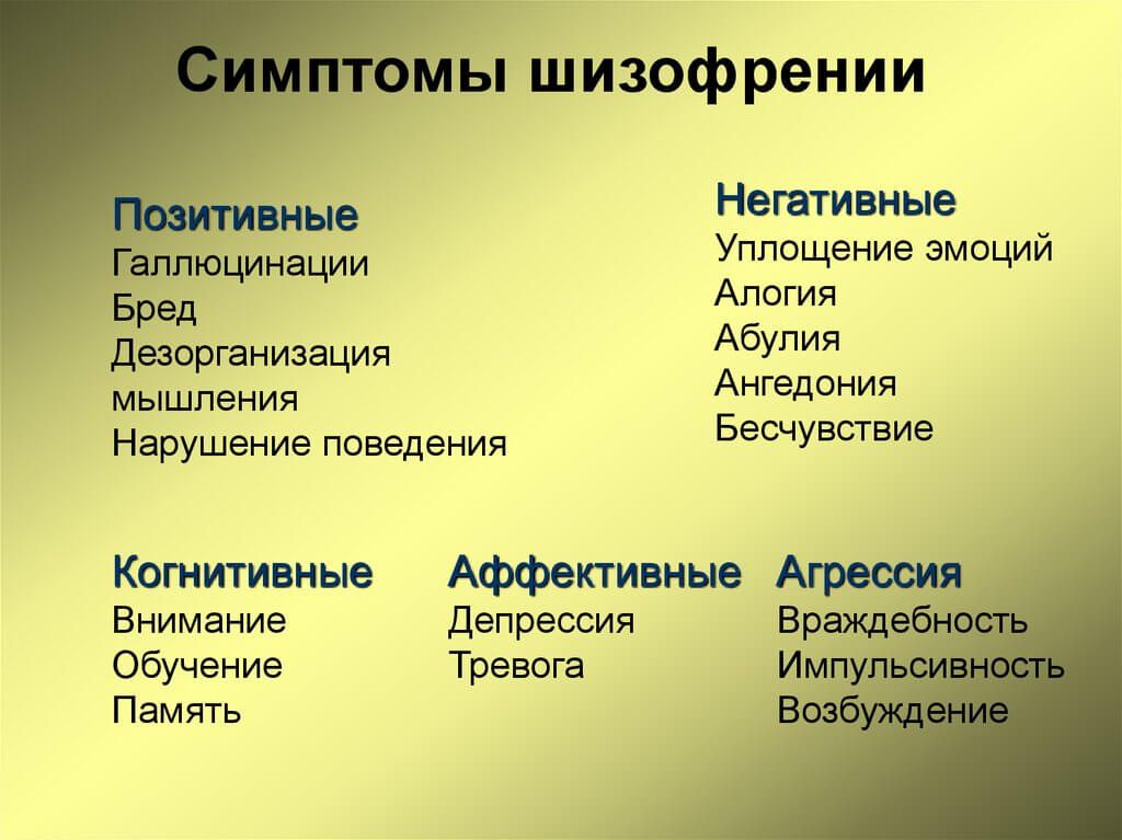 Ключовим моментом шизофренії є розпад психічної діяльності, в результаті чого відбувається втрата внутрішньої єдності інтелекту, емоцій і вольових функцій, також втрачається зв’язок особистості із зовнішнім світом.
