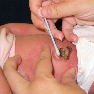 Так за допомогою ватної палички чи тампона перекисом необхідно обробити весь пупок, вмочаючи виділення і видаляючи утворилися жовтуваті скоринки. В процесі дезінфекції ватяні палички або тампони необхідно змінювати, щоб не переносити зібране ними вміст на ранку. Після цього ранка і невелика область навколо неї змащується зеленкою.