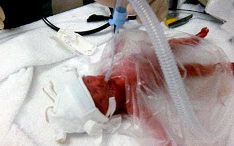У таких випадках обов’язково використовують спеціальну плівку. Малюка не обтирають і в перші хвилини життя обертають тулуб в герметичний пакет. Перед цим вирізають отвір під голову. До того, як помістити малюка в пакет приєднують датчики тиску, пульсу і температури тіла до правого зап’ястя. При проведенні катетеризації та інших маніпуляцій медики мінімально порушують цілісність пакета. У відділення інтенсивної терапії дитини доставляють в пакеті.