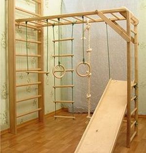 Куточок може мати вигляд шведської стінки і брусів, спорткомплексу в драбинкою з мотузок, грушею для боксу, гойдалками та іншими снарядами. Тут все залежить від ваших фінансових можливостей і площі, яку ви вирішили відвести під обладнання спортивного куточка.