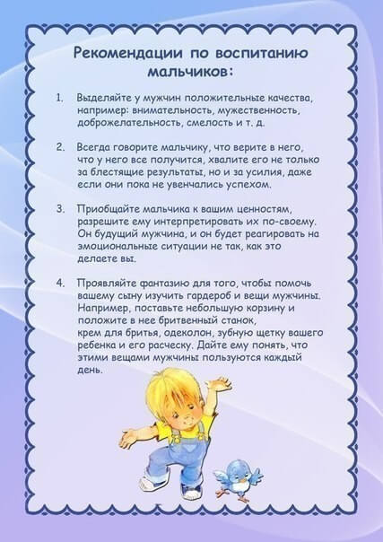 Намагайтеся спілкуватися з сином на рівних, розповідайте йому про свої досягнення і невдачі, краще всього на конкретному прикладі, щоб навчання було підкріплено реальними ситуаціями, в яких може опинитися дитина. Ніколи не варто обговорювати проблеми поверхово. У чоловікові повинен бути стрижень, тому йому необхідно розглядати кожну дрібницю детально і вчитися на своїх помилках.