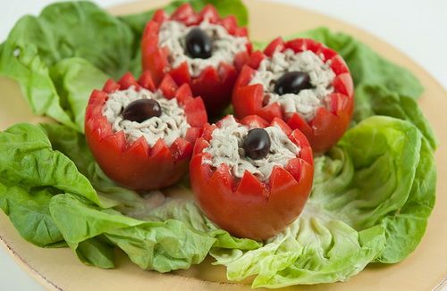 Помідори необхідно вимити, вирізати середину. Для начинки змішати яйця з дрібно нарізаним крабовим м’ясом і тертим сиром. Заправити фарш майонезом. Помістити начинку помідори, зверху прикрасити маслиною.