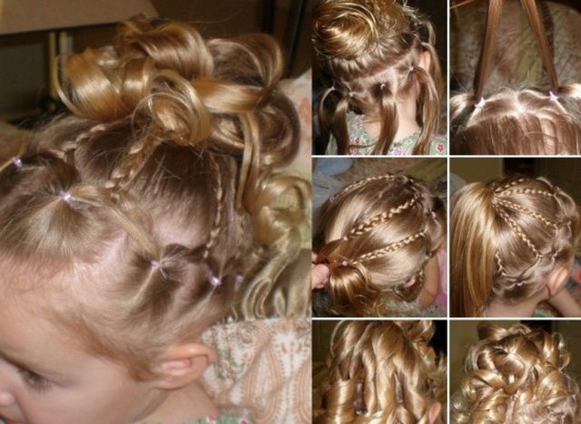 Щоб зробити дівчинки таку зачіску знадобляться невидимки, шпильки з квітами і 8 маленьких гумок для волосся. Можна скористатися маленькими крабами у вигляді метеликів чи пелюсток.