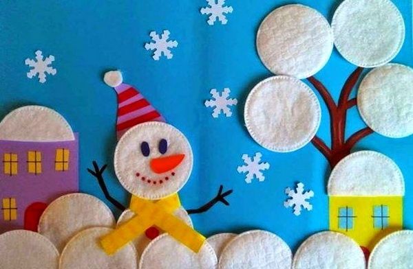 Заздалегідь продумавши сюжет свого твору, дитина попередньо вирізає і розподіляє на аркуші паперу сформовані з ватяних дисків і вирізані з кольорового паперу елементи аплікації. Традиційно ватні диски можна використовувати для імітації снігових заметів і формування частин тулуба сніговика.