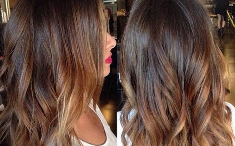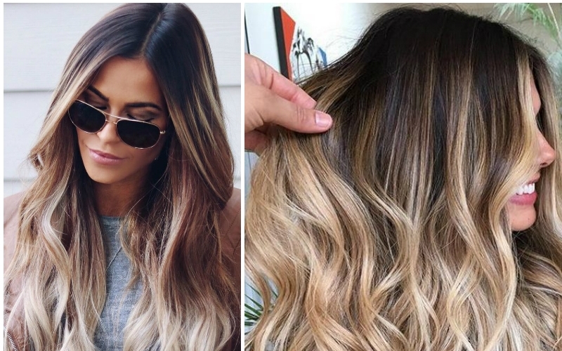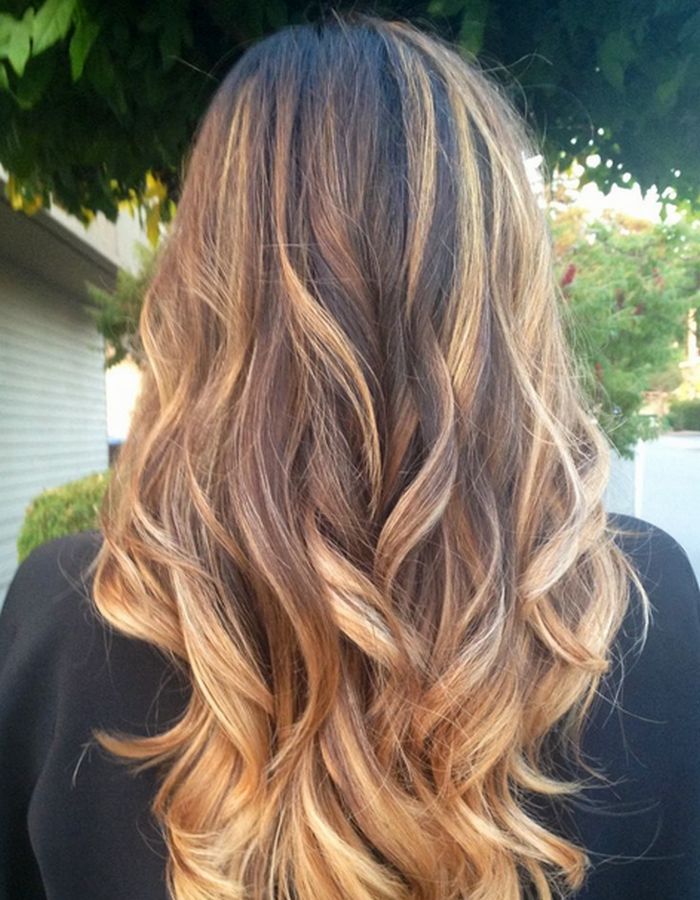 Балаяж запаморочливо виглядає на довгих , по різному завитого волосся. Гра фарб при світлі буде моделювати ілюзію об’єму і струмуючих пасм. Натуральні темні локони – нічого краще цієї основи для неординарного мелірування не придумали. Саме такий розклад дозволяє перукаря включити свою фантазію і застосувати талант по повній, експериментуючи з абсолютно різними фарбами.