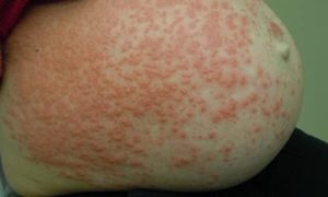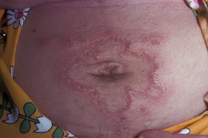 Ураження ділянок шкіри біля носа, повік, вушних раковин, на обличчі, руках і інших частинах тіла проявляється спочатку сверблячкою, печінням, а потім, по закінченні 1-го або 2-х днів – згрупованими бульбашками з прозорою або жовтуватою рідиною діаметром 0,1 – 0,3 см на фоні почервоніння і набряклості.