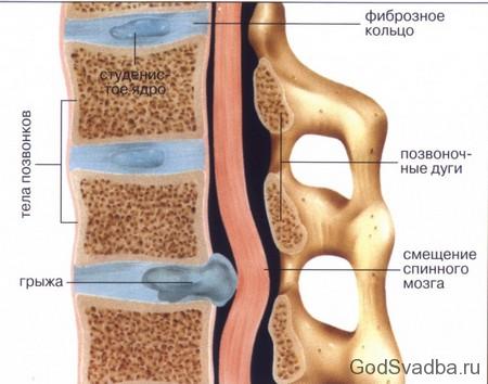 При захворюванні хребта спостерігається випинання в місці спинного мозку або в попереку.