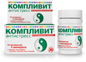 - Комплівіт Антистрес. Ліки відрізняється підвищеною концентрацією вітамінів групи В, які характеризуються позитивним впливом на роботу нервової системи. Також в ліках містяться рослинні компоненти з седативною дією. Препарат рекомендований до застосування пацієнтам, які страждають від хронічних стресів або особам, чия діяльність пов’язана з підвищеною розумовою навантаженням.