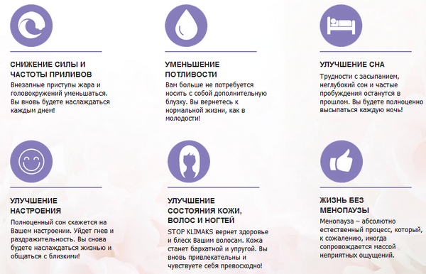 Інструкція із застосування крапель «Stop klimaks» свідчить, що їх регулярний прийом дозволить досягти наступних ефектів: