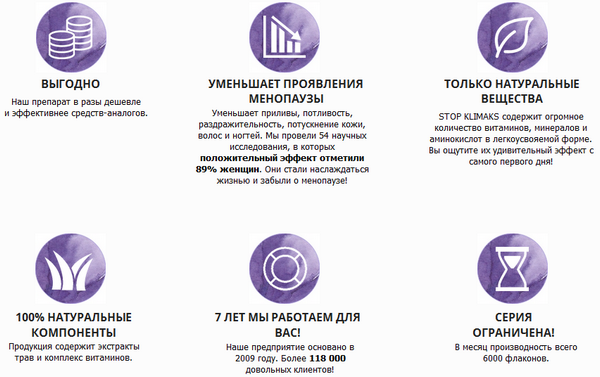 Що містяться в препараті «Stop klimaks» біологічно-активні рослинні адаптогени збагачені просто колосальною кількістю поживних і корисних речовин, причому перебувають у формі, найбільш правильною і зручною з точки зору їх засвоєння. Це вітаміни С, РР, Е, А, Д, В5 та інші, а також різні мікроелементи і мінерали, необхідні для підтримки жіночого здоров’я.