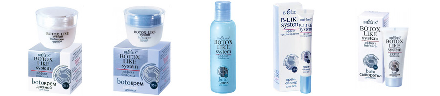 BOTOX LIKE system. Це білоруський антивіковий крем від компанії Беліта. Косметика цієї лінії включає денний і нічний крем, сироватку і маску для обличчя. Омолоджуючий ефект забезпечує утримання міорелаксантів -пептидів, які в комплексі з натуральними полісахаридами надають розслаблюючу, пом’якшувальну і зволожуючу дію. Крем швидко вбирається, відрізняється ніжною і повітряної структурою, освіжає і добре підтягує контури особи. З його допомогою можна ефективно розгладити дрібні зморшки і усунути сліди втоми.